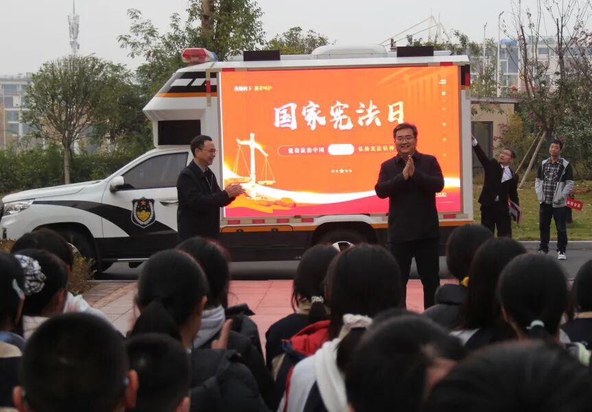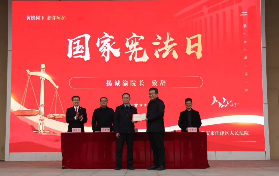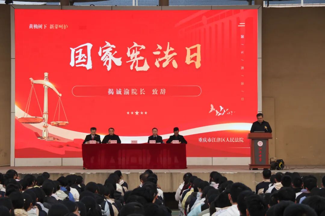在第十二个“国家宪法日”之际,为增强青少年法治意识、营造校园法治氛围,12月1日,重庆市江津中学校与江津区人民法院携手,成功举办了“宪法守护成长,关爱少年未来”主题普法宣讲活动。活动通过“沉浸式体验+精准化宣讲”的多维形式,为师生带来了一场集聘任、宣讲、体验于一体的法治教育实践课。江津区人民法院党组书记、院长揭诚渝,党组成员、副院长杨继光一行及学校党委书记张跃国、党委副书记、校长羊自力、副校长郎永龙出席了本次活动。