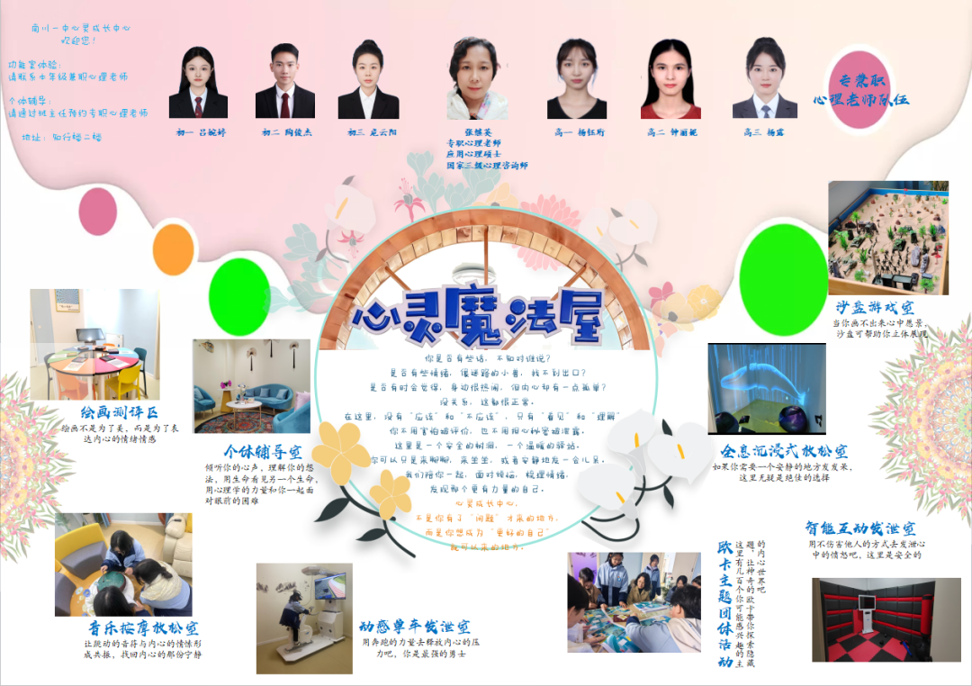本中心占地100多平方米,有七大功能齐全的心理功能室,让学生们在体验中情绪得到发泄、身心得到放松、心灵得到疗愈。心灵魔法屋定期向学生开放体验,已成为学生放松身心的好去处,得到学生们一致好评