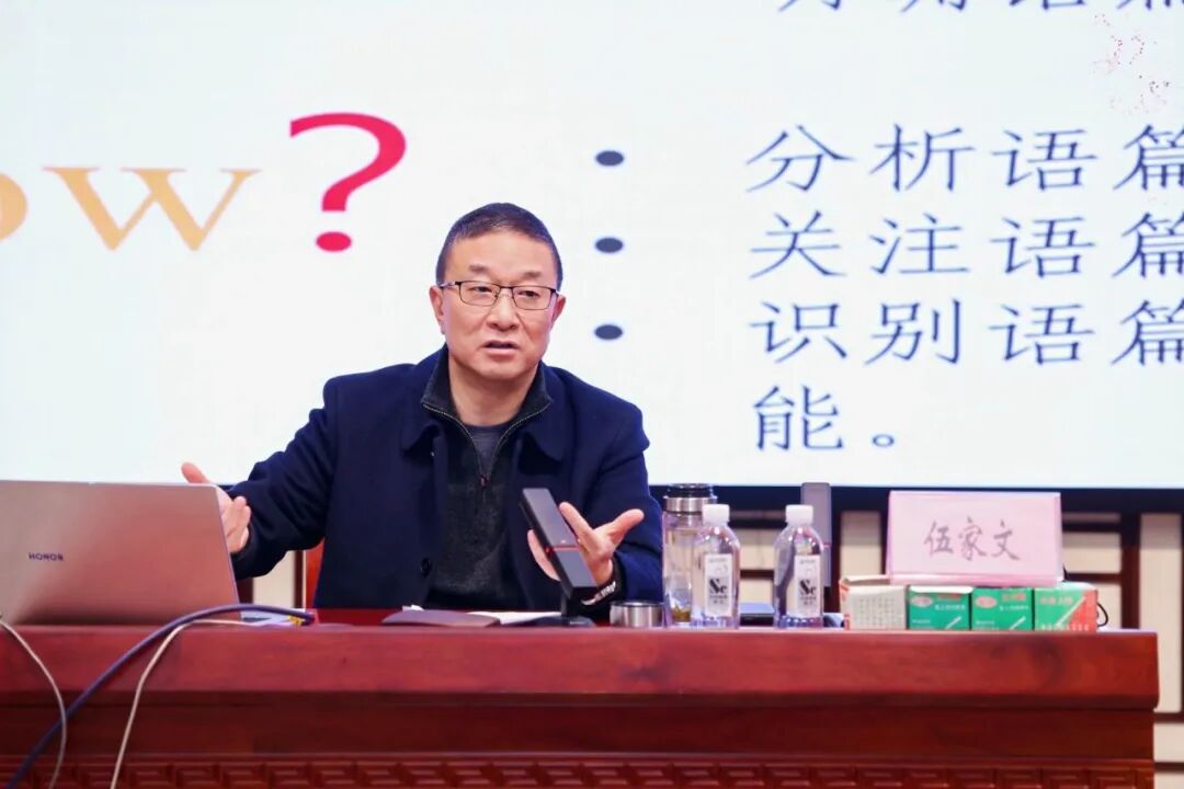 市教科院伍家文博士肯定两课“听说思结合、思政融入”的亮点,随后围绕“基于语篇分析的高中英语教学设计”开展讲座,详解语篇研读方法与教学目标制定,为教师答疑解惑。