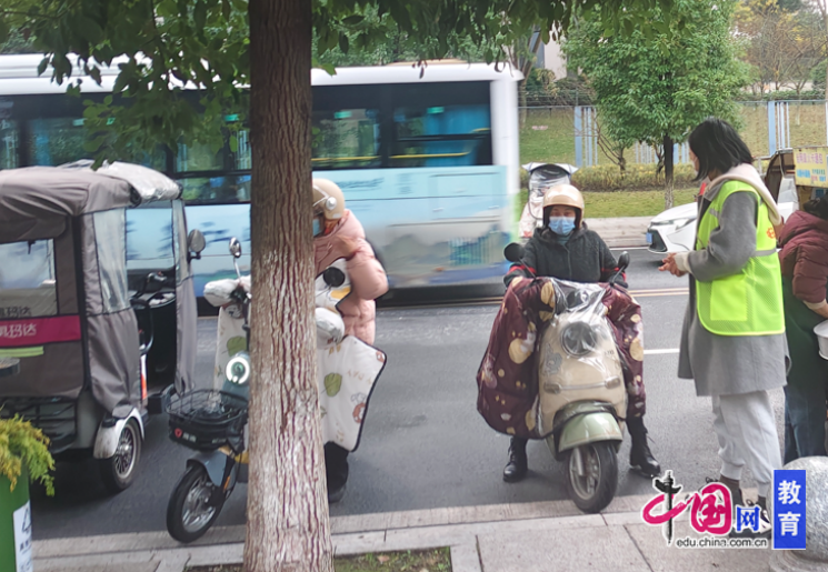 与此同时,教师向全体家长发出倡议,在班级群里发相关交通安全的知识,引导家长发挥榜样作用,形成“家园社”协同育人的良好格局。放学时,护学岗人员提醒家长电瓶车不超载,并且戴好头盔。