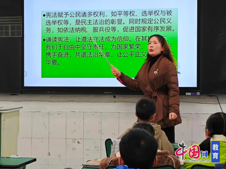 宪法宣传周期间,全校各班级全覆盖开展宪法主题班会。班主任精心打磨课件,以通俗生动的语言阐释宪法的根本地位与核心要义,细致解读公民基本权利与义务、国家机构职能等关键内容。课堂上,师生共同观看宪法宣传公益视频,齐唱学校原创普法歌曲《童声颂宪法》,在视听融合中体悟宪法的温度与力量;班主任结合校园生活实例和典型法治案例,引导学生思考如何运用法律武器维护自身合法权益,倡导全体学生以宪法为根本行为准则,自觉维护宪法权威,让法治理念真正融入日常、根植于心。