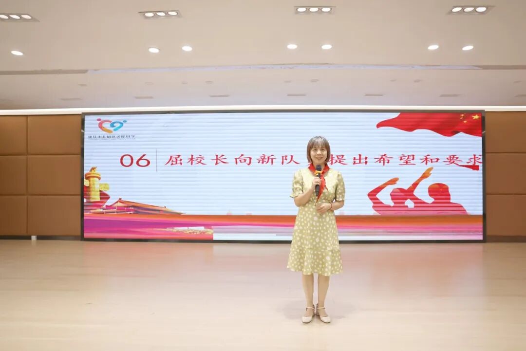 在这个意义非凡的时刻,学校党支部副书记、校长、少工委主任屈小梅满含期待地对新队员提出希望,希望孩子们严格要求自己,为红领巾增光,努力成长为德智体美劳全面发展的时代好少年 。在大队辅导员刘小芳老师的带领下,全体队员齐声呼号。
