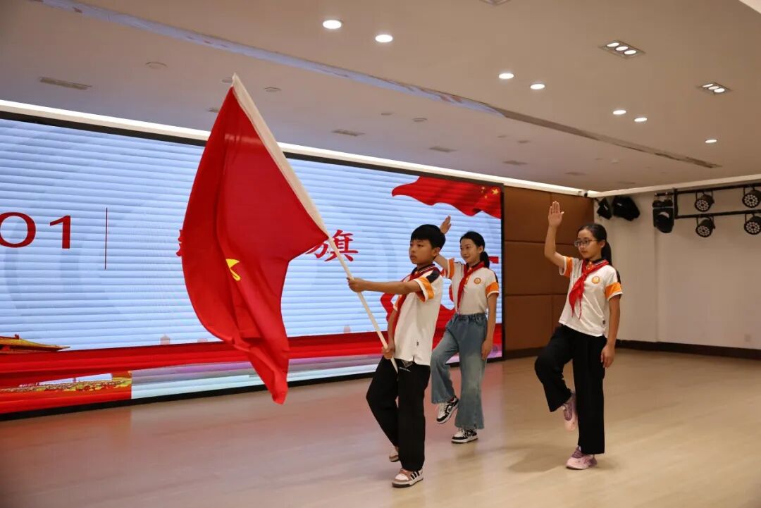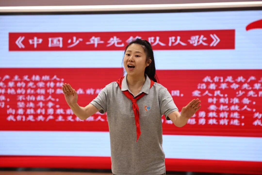 全体队员高唱《中国少年先锋队队歌》,嘹亮的歌声响彻校园。