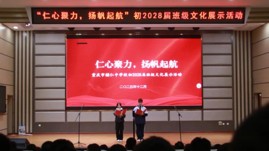 本次评比由仁文化工作小组梁强老师、钟文老师,音乐组陈娜老师、夏关秋阳老师担任评委,从文化内涵、表现形式、整体效果等方面进行综合评价。班级代表依次登台,围绕班训、班徽、班歌、班旗及班级寄语进行深入阐述,展现了各班级独特的文化理念与价值追求。随后,各班级通过朗诵、舞台剧、合唱、器乐表演等多种形式,生动呈现了班级凝聚力与创新精神,充分体现了“仁心聚力,扬帆启航”的活动主题。