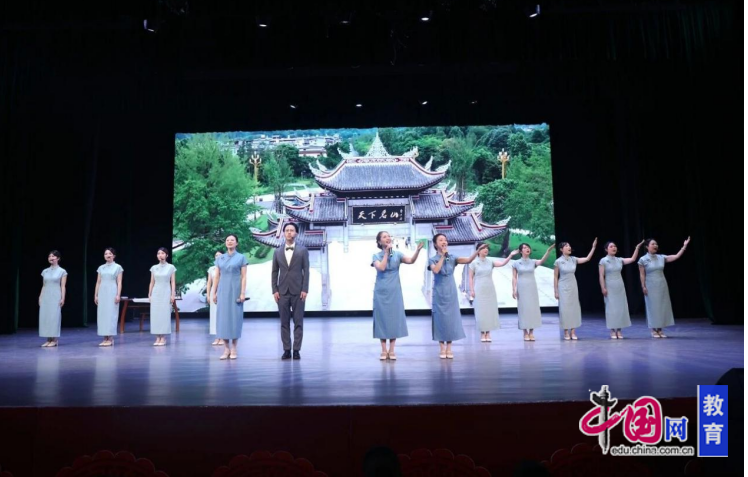 舞台上,老师们以抑扬顿挫的语调、真挚饱满的情感,将郭沫若与“天下名山”牌坊的情缘和郭沫若笔下经典诗篇《峨眉山上的白雪》娓娓道来。时而慷慨激昂地吟诵,时而轻柔婉转地诉说。表演中,情景演绎与诗歌朗诵相结合,配合悠扬的古典音乐与唯美的背景画面,将沫若文化与峨眉山水完美融合,带领现场观众穿越时空,感受文学与自然交织的魅力。