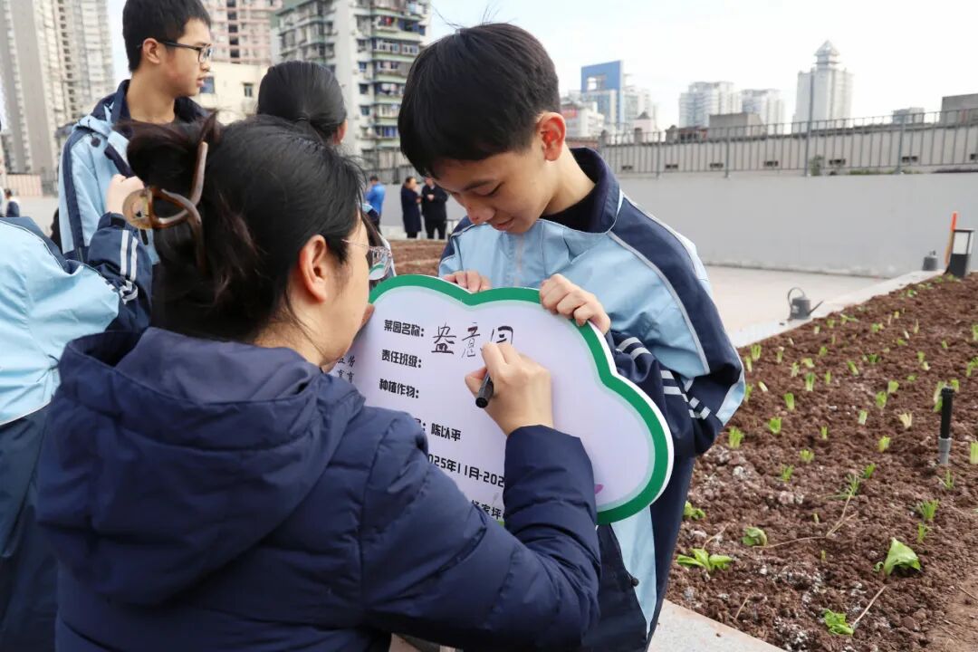 随后,活动进入庄重而富有意义的授牌环节。各班学生代表郑重接过“耕成菜园承包牌”,并将这份象征着责任与希望的“土地契约”带回班级,同学们认真地在承包牌上书写班级、富有创意的菜园名称以及计划播种的作物。一笔一画间,承载的是对一方田地的承诺,对一段成长旅程的期盼。这片基地,将成为同学们体验春播、夏耘、秋收、冬藏的窗口,为校园生活增添一抹生动的色彩。