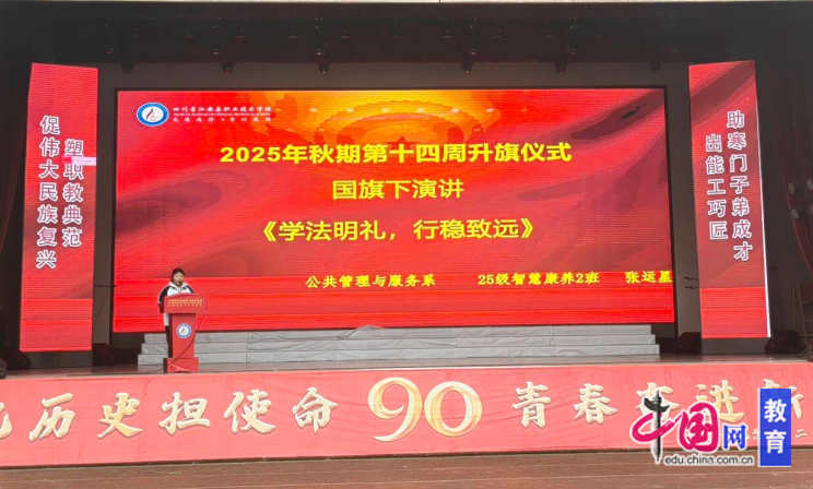 在第十二个国家宪法日之际,四川省江安职业技术学校(以下简称“江安职校”)2025年秋期第十四周升旗仪式暨国旗下演讲活动如期举行。