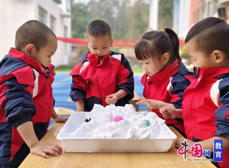 近日,乐山市市中区茅桥幼教育集团茅桥园区以“大雪”为主题开展系列活动,孩子们通过触摸冰块、玩转色彩、解锁宝藏、制作甜品等多元游戏,在五感体验中感受冬日魅力,收获探索快乐。