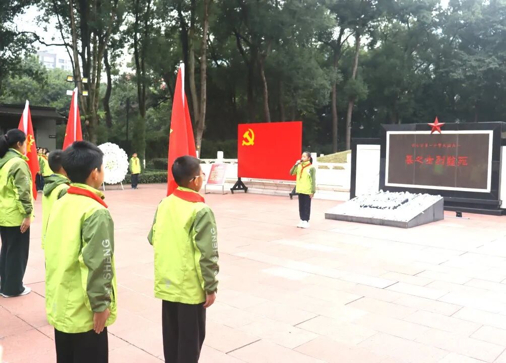 在庄严肃穆的主题队会上,队员们通过默哀、敬献花圈、朗诵诗篇,深切缅怀红岩英烈。叶挺的《囚歌》、陈然的《自白书》在少年铿锵的诵读声中回荡,传递着革命者视死如归的浩然正气。随后,党旗、团旗、队旗在队伍前依次展开——鲜红的党旗昭示着坚定的信仰,闪耀的团旗汇聚着青春的力量,飘扬的队旗与胸前的红领巾交相辉映。三面旗帜之下,是一颗颗赤诚跳动的心,在烈士墓前绘就红色基因代代相传的生动画面。