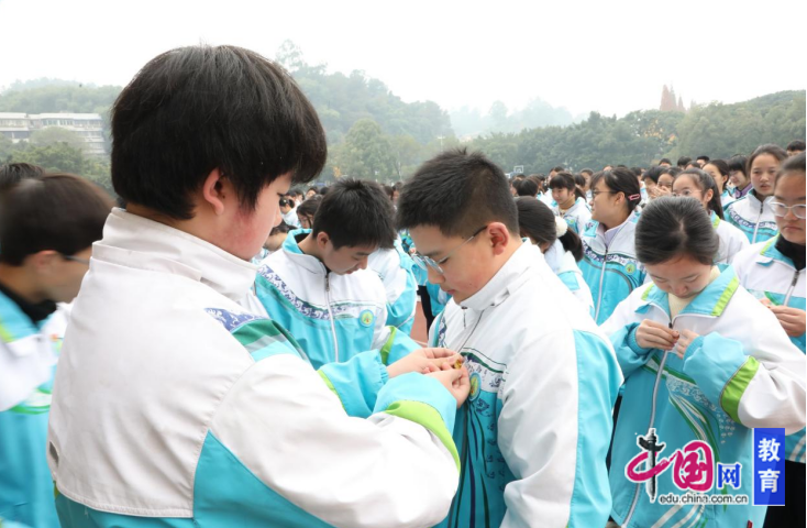 悠扬的团歌声中,九年级各班团支书依次为新团员颁发并佩戴团徽。一枚枚闪耀的团徽,既是荣誉的象征,更是责任的承载,标志着新团员正式开启崭新的政治旅程。