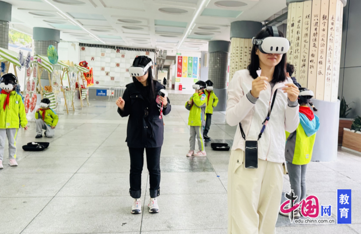 “我校通过课程融合、环境育人及技术赋能,正积极探索符合未来素养要求的教育实践路径。”校园参观时,少城小学德育处冯靖老师向来访嘉宾介绍了学校的历史沿革和校园文化。少城小学的校园环境全面渗透育人功能,从“少”字校徽、清风亭箴言,到“亲、轻、静、净”行为规范与“少城大典”,形成浸润式德育场域。在本学期,学校的班级文化建设以“向着胜利出发”为主题,通过夸夸墙、品格展示区与动态评价机制,营造支持性成长氛围。“书行流韵”大厅设置的XR体验区,借助增强现实等科技手段,开展互动式学习,促进“书以载道,文而化人”的人文精神与“科技强国”教育导向的深度融合;面塑、剪纸、扎染等非遗展示融入地域文化与廉洁教育,彰显学校持续发展的教育活力。
