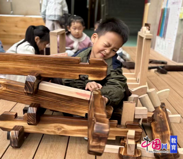活动中,孩子们自由分组、自主选材,有的合作搭建城堡,有的尝试拼接机械结构。一名小男孩在搭建大型木质器械时,眉头紧锁、专注发力,反复调整积木的拼接角度,即便遇到积木错位的难题,也没有放弃,而是和小伙伴互相探讨、动手尝试。从简单的堆叠到复杂的榫卯拼接,孩子们在亲手操作中感知空间关系,锻炼手部精细动作,更学会了在合作中解决问题。