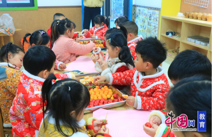 采摘过后,一场充满趣味的美食DIY活动随即开启。孩子们围在操作台旁,用竹签把橘子一个一个地串起来,再搭配上其他水果,淋上熬好的糖浆,一串串糖葫芦让人垂涎欲滴。另一边的包饺子区域同样热火朝天。家长代表们化身志愿老师,手把手带着孩子们填馅、捏褶。孩子们小手忙个不停,包出的饺子歪歪扭扭、形态各异,有的还“露了馅”,却个个都藏着满满的童真与心意。