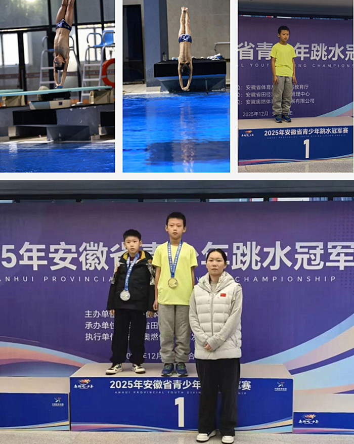 2025年12月,安徽省青少年跳水冠军赛在合肥市举行。赛场之上,蚌埠市蚌山小学运动健儿奋勇拼搏,凭借扎实的技术与稳定的发挥,展现了蚌埠市蚌山小学学子的卓越风采:四3班梁梓毅同学实力超群,一举拿下男子乙组1米跳板冠军、男子乙组5米跳台冠军。