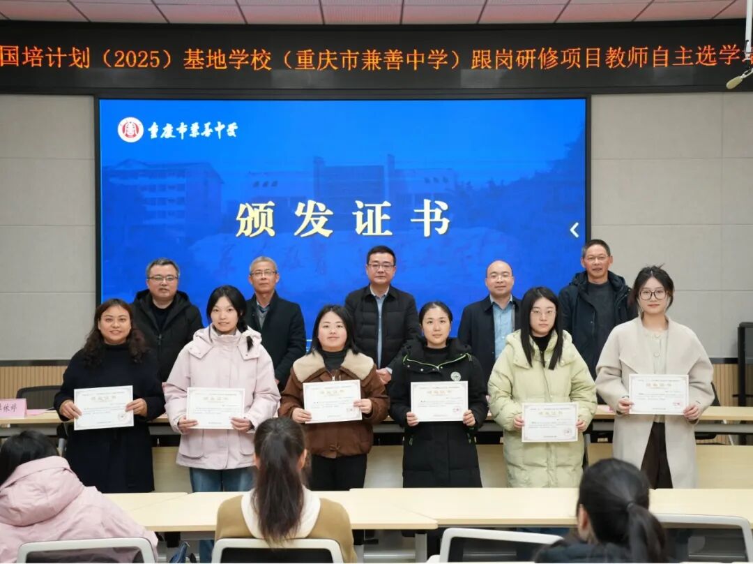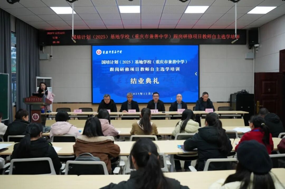 冬日暖阳映照兼善校园,硕果盈枝见证学有所成。12月22日,2025年“国培计划”基地学校(重庆市兼善中学)跟岗研修项目教师自主选学培训结业典礼隆重举行。唐亮校长、王照标副校长,学科导师吴常光、梁吉成、李兴科,以及来自重庆市各区县的20名参训学员共同出席了典礼,典礼由李依婷副主任主持。