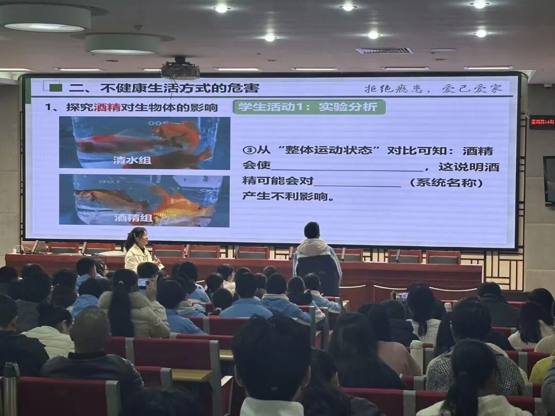 课例展示阶段,兼善中学段静老师带来《选择健康的生活方式》示范课。课堂以“小明的健康困惑”真实生活情境为切入点,打破传统知识灌输的教学模式,通过提供小鱼尾鳍血液流速、水蚤心率实验数据等“科学证据工具包”,引导学生自主分析、亲手探究,建构“酒精、烟草有害健康”的科学认知;课堂中设置“五次选择”实践环节与健康承诺展示活动,让学生在情境体验中强化健康行为参与的自信,同时将个人健康选择与“健康中国2030”国家战略相联结,实现了从健康知识传授到家国情怀培育的升华。