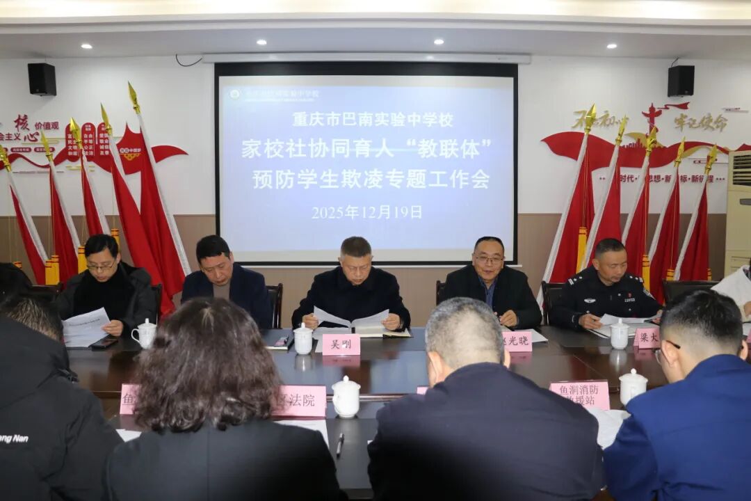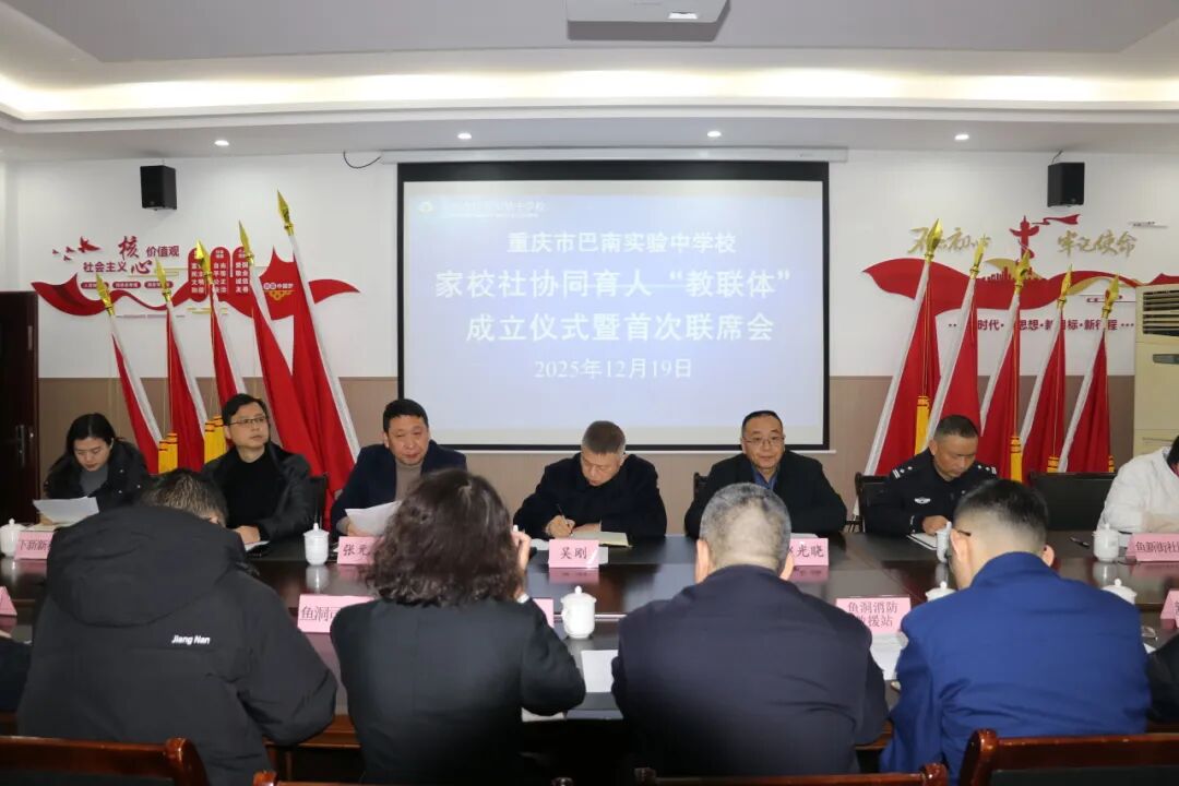 为落实立德树人根本任务,破解学校教育、家庭教育、社会教育各自为战的孤岛困境,构建全环境育人新格局,重庆市巴南实验中学校牵头联动21家单位及全体家长,创新打造家校社协同育人“教联体”。2025年12月19日,“教联体”成立仪式暨首次联席会在重庆市巴南实验中学校顺利举行。