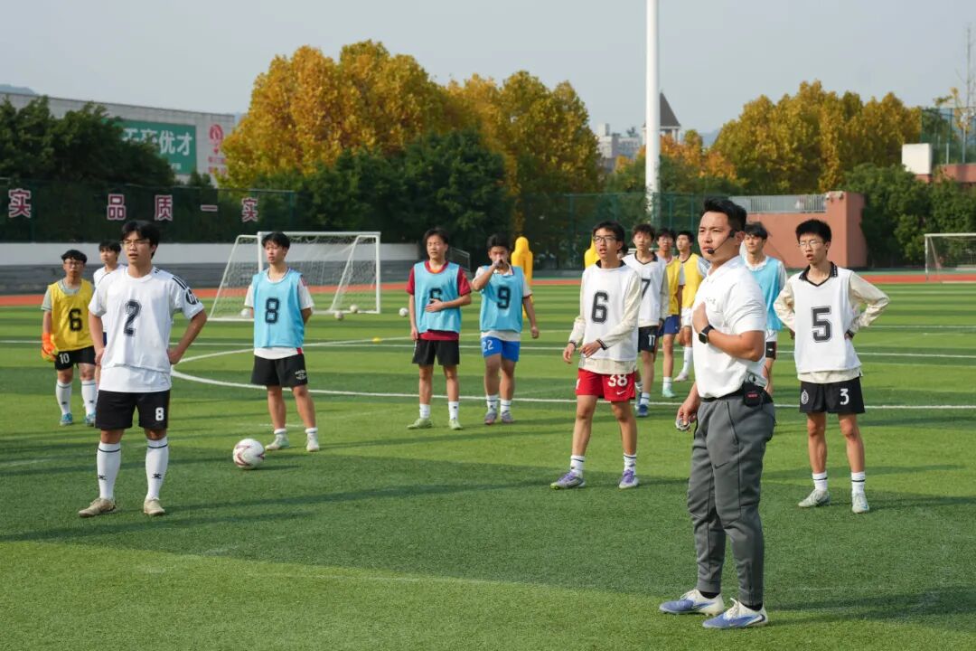 杜春昌老师执教足球课,通过“穿越挑战赛”等游戏化环节,引导学生在不同情境中提升射门技术与决策能力。