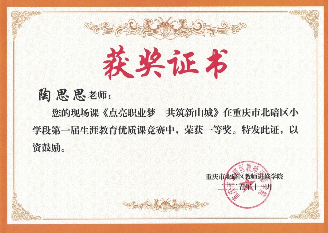 重庆市思源小学陶思思老师在重庆市北碚区小学段第一届生涯教育优质课竞赛(现场赛)中荣获一等奖。