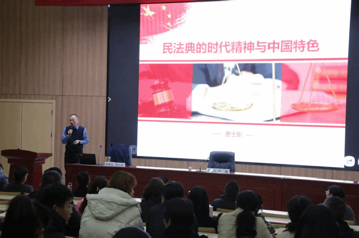 报告中,曹士东教授以“民法与民法典的概念区分”为切入点,清晰阐释了《民法典》的法律地位与核心原则。围绕未成年人权益保护、校园安全、网络行为等与师生密切相关的主题,曹教授结合具体案例,深入解析了《民法典》中关于民事行为能力、监护制度、侵权责任、个人信息保护等条款,生动阐释了法律如何规范校园生活中的行为,保护师生的合法权益。