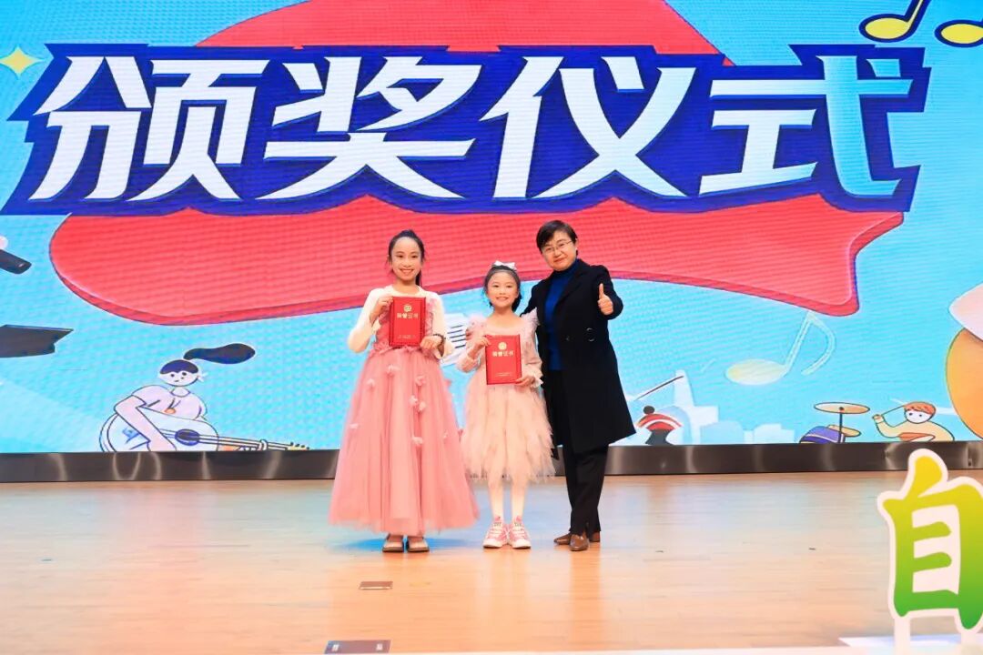 经过激烈角逐,14位选手分别获得“金葵小百灵”“银韵小歌手”“铜彩小唱将”和“萌音小歌星”称号。校领导为获奖选手颁奖,见证他们的荣耀时刻。