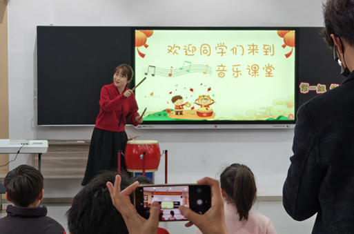 歌曲学唱环节,针对学生演唱中易出现的音准、节奏问题,张田老师采用“跟钢琴慢速唱—跟伴奏完整唱”的梯度引导方式,强调正确歌唱姿势,指导学生用富有弹性的声音传递歌曲情感。拓展环节,她还融入南北传统新年民俗元素,带领学生学习秧歌舞典型动作、体验醒狮表演乐趣,让学生在肢体律动中感受传统节庆文化魅力。