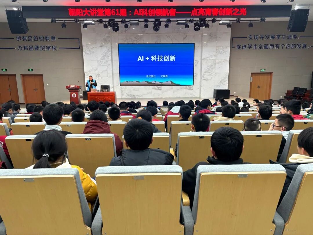 当智能算法碰撞奇思妙想,当实践案例点燃创新火种,一场兼具深度与温度的科技创新盛宴,在重庆市朝阳中学的校园里热力绽放!2025年12月24日,第61期 “朝阳大讲堂” 如期而至,学校特邀重庆市綦江区教育信息技术与装备中心正高级实验师、教育装备与科技教育领域资深专家文联森老师,为科技社团的同学们带来《AI+科技创新》专题科普讲座。深耕机器人教育 20 余年的文老师,累计辅导学生斩获省市及以上奖项 900 余次,囊括国际机器人竞赛 18 枚金牌,用满满的专业干货与生动实践经验,为学子们点亮了 AI 时代的创新之路。