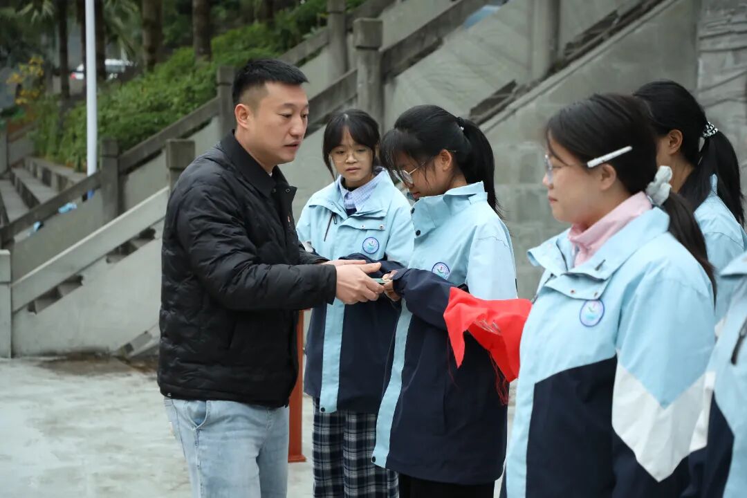 江口中学副校长张明均为新团员颁发团员证、佩戴团徽,当闪亮的团徽别在胸前,新团员们的眼中满是坚定与自豪。