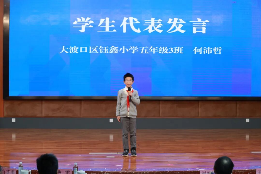 五年级学生何沛哲作为小院士代表分享科创经历,他和队友凭借AI校园运输小车项目一路斩获市赛、国赛荣誉,并在重庆市第二届中小学科学教育大会中作为优秀作品展演的故事,生动体现了钰小学子在“雏鹰计划”中的成长与收获。