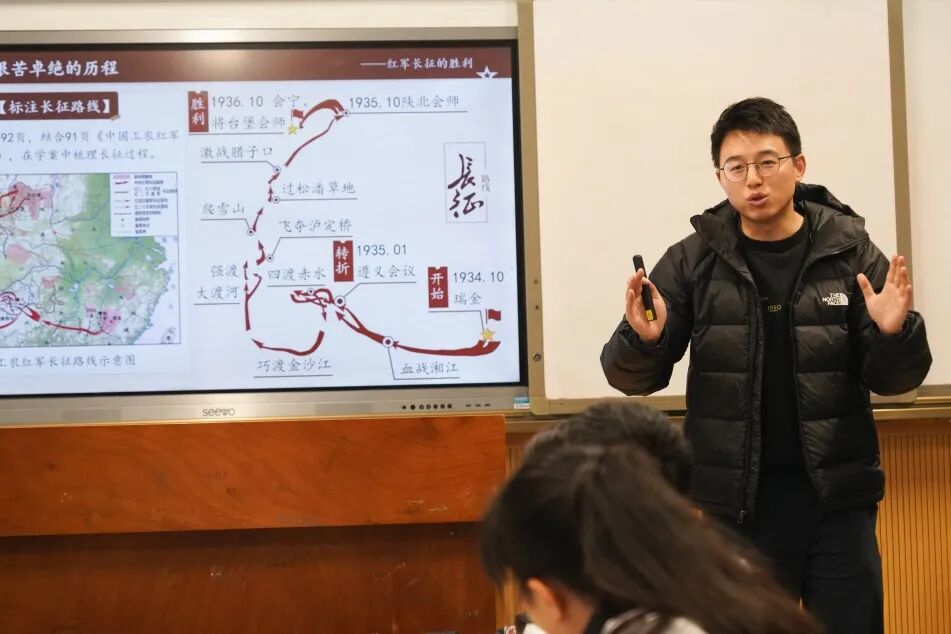 历史教师杨杰的《中国工农红军长征与遵义会议》更是一堂“行走的党课”。他以《长征日记》为视角,通过“血战湘江”与“四渡赤水”的对比,让学生在小组讨论中自主归纳转折之因;在“半条被子”的故事里,感悟共产党人的初心。当学生畅谈“长征精神”时,那不再是课本上的抽象概念,而是心中涌动的情感认同。