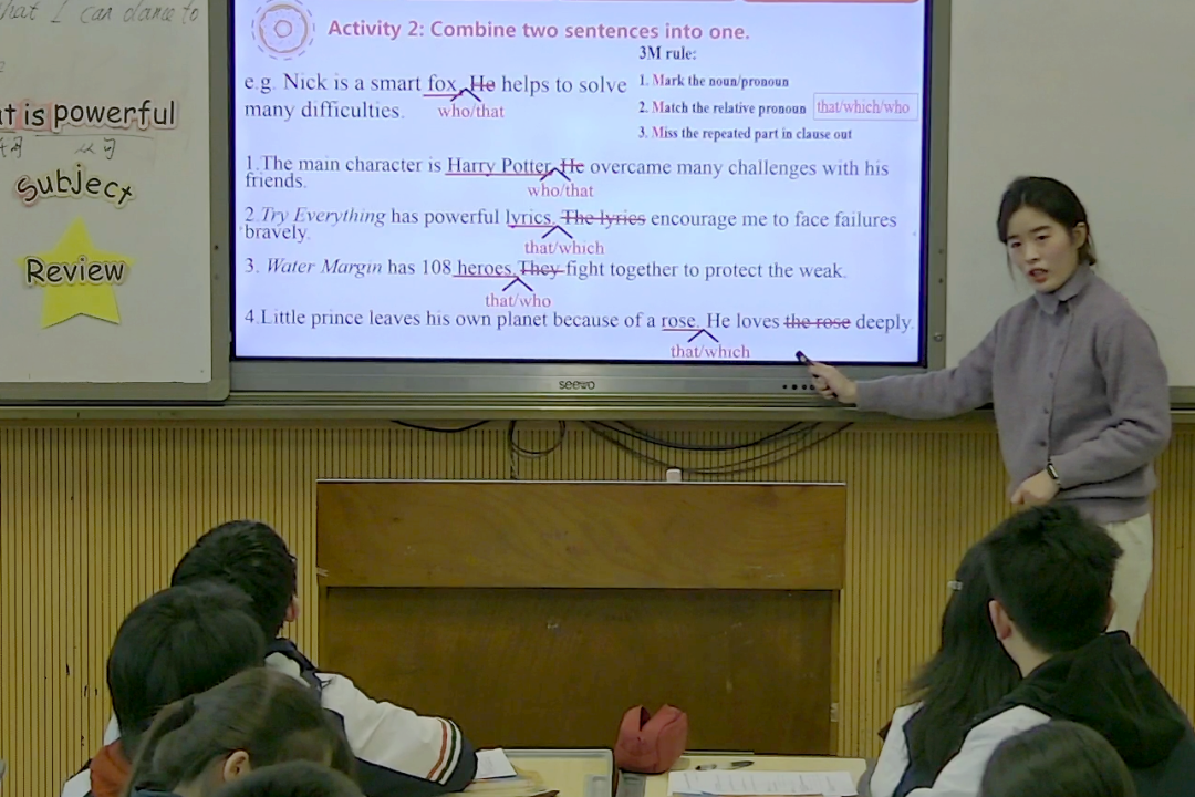 英语课上,翁明露老师以学校英语节征集影评的真实情境导入,通过“3M 规则”拆解定语从句构建过程,配合双人互助、小组创作、全班“说猜” 等递进式任务,让语法学习告别枯燥记忆。