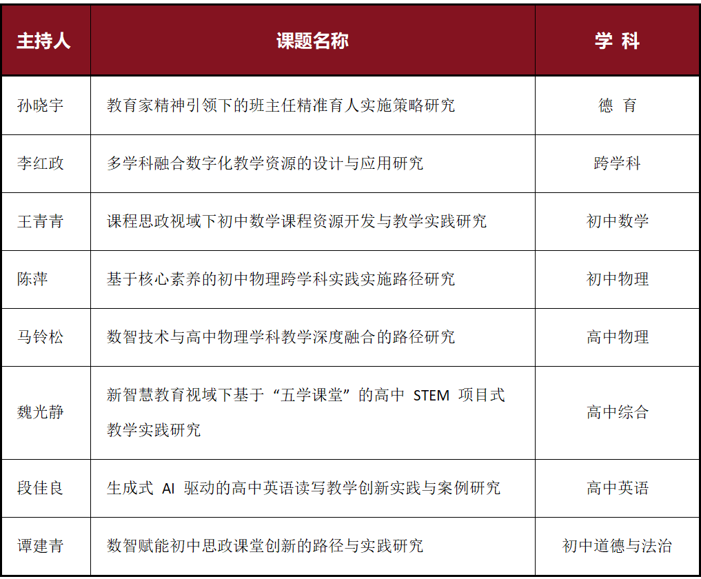 课题涵盖市级、区级两大层级,既有对教育数字化转型、跨学科融合等前沿领域的探索,也有对班主任育人实践、学科核心素养培养等基础环节的深化研究,形成“上下联动、多点突破”的科研格局,全面回应新时代教育发展的多元需求。