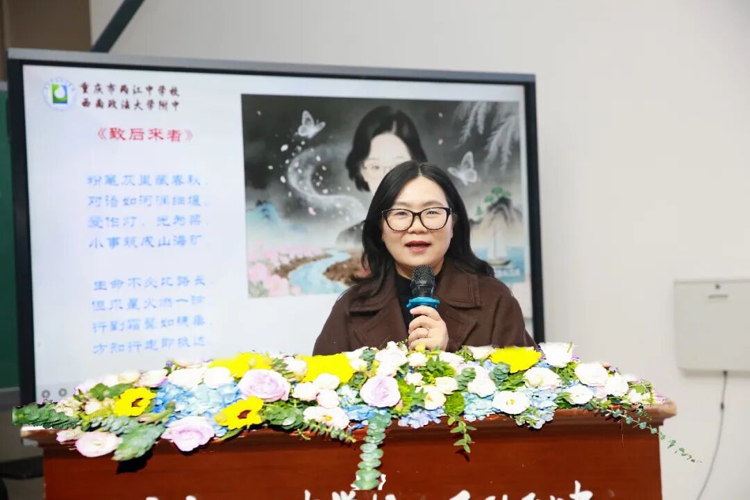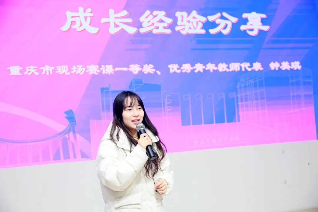 优秀青年教师代表、重庆市现场赛课一等奖获得者钟美琪以“‘青’舟无惧万重山”为题,详细分享了自己三年间从一名新教师成长为重庆市现场赛课一等奖获奖教师的成长历程,以及班主任工作的心路感悟。她坦言成功的秘诀就是做好职业规划,不断树立目标,保持热情,在教学岗位上实现人生价值。