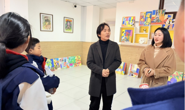 12月24日,展览现场,美术教研员丁尚福老师在学校领导及美术组教师的陪同下,仔细观看了每一件作品。丁老师对展览的整体水平与多样性给予了高度评价。他特别赞赏了同学们在作品中展现出的大胆的创新意识、真挚的情感流露以及逐渐成熟的技术探索。他指出,许多作品不仅体现了扎实的课堂所学,更融入了个性化的思考,这是艺术教育非常宝贵的成果。师生们驻足观赏、轻声交流,在一幅幅佳作中感受校园美育的丰硕成果,也为后续的书法创作积累了审美经验。