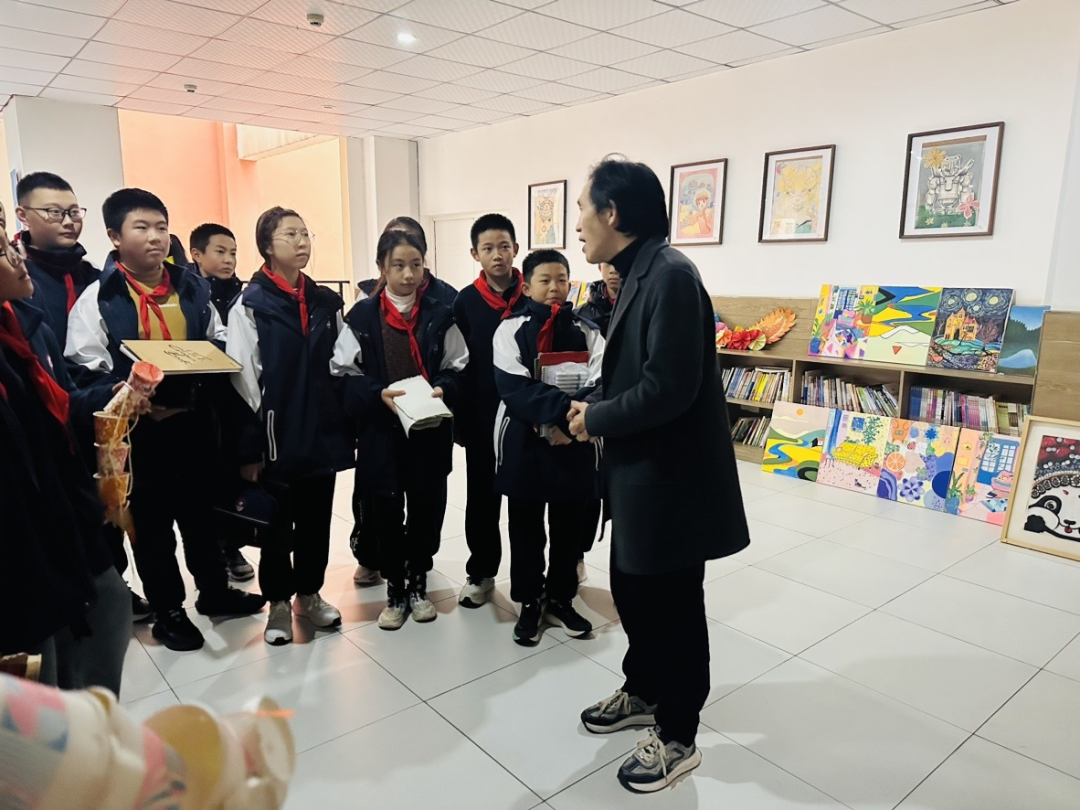 随后,丁老师面向美术兴趣小组及全体观展学生,开展了一场题为 “如何看见与创造:走进绘画的世界” 的微型讲座。他结合展出的具体作品,深入浅出地讲解了欣赏绘画的多个维度,从“看”到“看见”:引导同学们观察作品的构图、色彩、线条等形式语言;理解“画语”:分享如何通过画面内容与风格,解读作品背后的故事与观念;激发“创造”:鼓励创作源于生活,要敢于表达自我,并讲解了从灵感到成稿的思考过程。