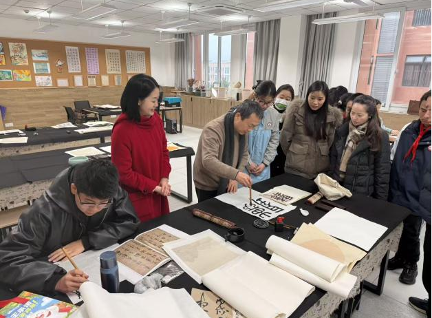 在教学实践分享环节,介绍了书法作品的多种形式与创作技巧,包括横幅、竖幅、斗方、对联、中堂等,讲解了从右至左的传统书写规范、落款位置与印章使用常识,尤其分享了通过声调辨别对联上下联的实用窍门。针对教学与学习,他提出四大策略:构建师生学习共同体,与学生共同进步;注重学习过程,培养书法欣赏者与实践者;融合现代技术,利用APP、AI模型等工具提升集字与课件制作效率;推动学科融合,将语文诗词、成语等内容融入书法练习,增添学习趣味性。鼓励师生以集字创作为起点,多积累、多练习、多感悟,从自然与经典中汲取灵感,实现从模仿到独立创作的跨越,在书法学习中传承千年文脉、提升综合素质。据悉,本次活动还设置了艺术作品欣赏与笔会实践环节,师生们在三楼美术教室周边欣赏书法与美术作品,并参与集字创作练习,将讲座所学付诸实践。