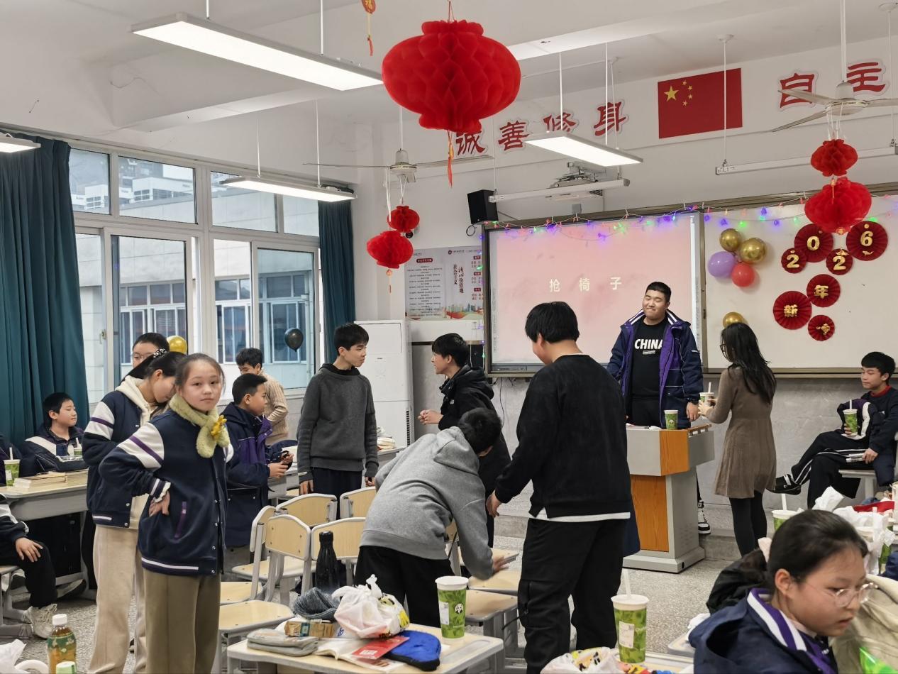 初一年级的同学们率先带来了欢声笑语。初一一班的活动尤为热闹:既有紧张刺激的“击鼓传花”,花球伴着鼓点在同学们手中飞快传递,鼓声一停,“幸运儿”的即兴表演总引来阵阵欢笑与掌声;随后进行的“抢凳子”游戏同样乐趣十足,同学们随着音乐节奏绕椅而行,音乐骤停时的敏捷反应与趣味互动,将气氛推向高潮。