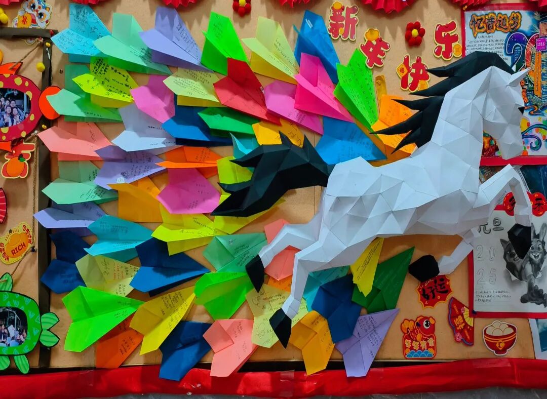 活动未启,氛围已浓。各班级精心策划的迎新文化展板,成为一道亮丽而独特的风景线。同学们巧思妙手,将重庆特有的“火锅”文化元素搬上墙,氤氲的热气仿佛携着麻辣鲜香扑面而来,绘出的是地道的人间烟火与团聚暖意;与之相映成趣的,是一匹匹昂首奋蹄的立体骏马,它们或由彩纸拼贴,或以画笔勾勒,凌空之势呼之欲出,象征着“骏马蹄疾”,奔腾着迈向崭新未来的昂扬斗志;更有班级合影、荣誉瞬间、集体目标等个性化内容点缀其间。一面面文化墙,不仅是巧手与智慧的结晶,更是班级凝聚力与精神风貌的集中彰显,为元旦活动奏响了精彩序曲。