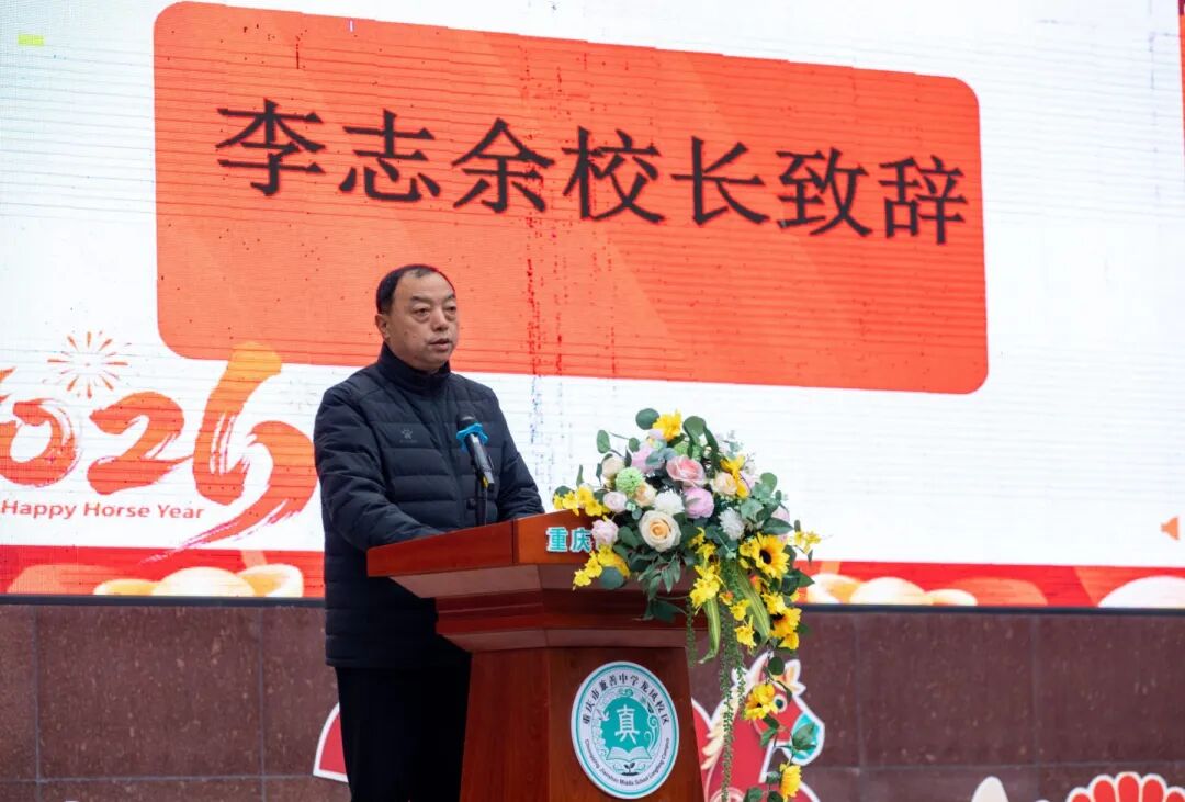 汇演现场,李志余校长发表新年致辞。校长首先代表学校向全体师生及家长致以新年的问候,充分肯定了2025年全校师生凝心聚力、真抓实干取得的丰硕成果,无论是教学质量的提升还是校园文化的建设,都彰显了龙凤学子的奋进姿态与教师队伍的责任担当。同时,校长鼓励全体师生坚守初心、追求卓越,在新的一年里共筑学校发展新辉煌,真挚的话语引发全场热烈共鸣。