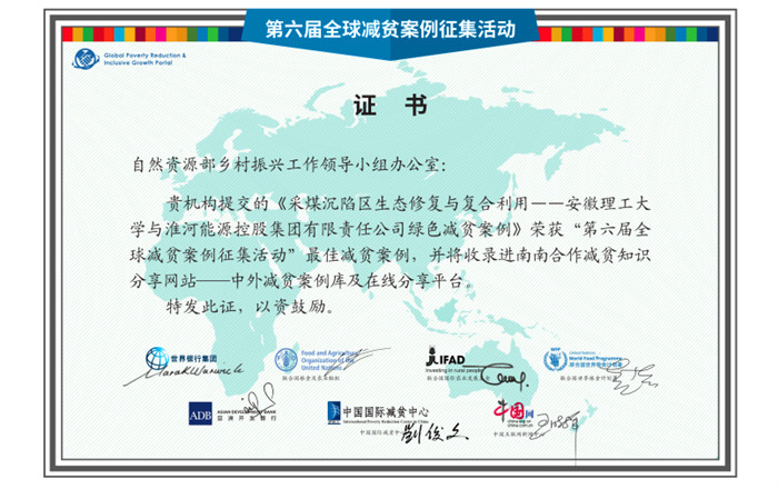 近日,由联合国粮食及农业组织、联合国世界粮食计划署、世界银行、国际农业发展基金和亚洲开发银行、中国国际减贫中心、中国互联网新闻中心等七家机构联合发起的第六届“全球减贫案例征集活动”评选结果揭晓,共有108个案例入选。袁亮院士牵头,安徽理工大学环境学科团队与淮河能源控股集团有限责任公司合作完成的《采煤沉陷区生态修复与复合利用——安徽理工大学与淮河能源控股集团绿色减贫案例》入选并荣获“最佳减贫案例”,被收录于南南合作减贫知识分享平台——中外减贫案例库及在线分享平台。
