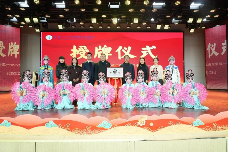 演出结束后,现场举行了庄重而温馨的“小徽班”戏曲传承基地授牌仪式。在学校领导与特邀嘉宾的共同见证下,揭牌仪式正式举行。随着红色幕布缓缓揭开,“小徽班戏曲传承基地”牌匾呈现于众人面前。仪式现场,身着戏曲表演服装的六年级同学们整齐列队,以优雅的姿态配合这一重要时刻,展现了学校戏曲教育的扎实基础和学生的良好素养。