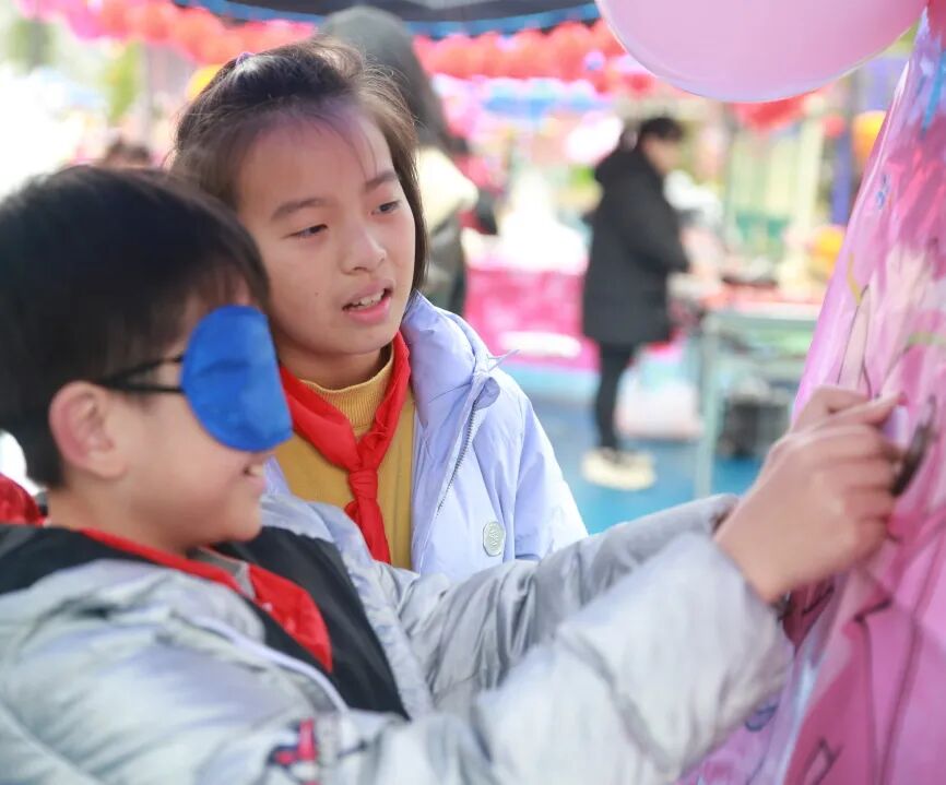 仪式结束后,古韵游园活动开启,各班传统游戏摊位前迅速排起长队。同学们满怀期待穿梭其间,校园满是欢声笑语。 一年级投壶摊位,小同学在老师指导下专注尝试,成功入壶便欢呼;隔壁陀螺摊位,高年级同学熟练操控,引得喝彩。滚铁环、跳房子等各类游戏摊位人气爆棚,同学们各展身手,乐此不疲;套圈、锤丸等项目前,大家踊跃参与,成功后收获满满成就感,老师及时盖章鼓励。此外,飞花令、写福字、剪纸等传统赏玩摊位备受喜爱,同学们动手动脑感受传统魅力,成功后手持盖有印章的体验券满心自豪。随着参与项目增多,同学们的游园卡渐渐盖满鲜红印章。
