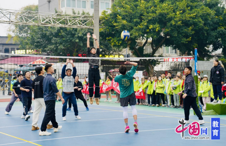 庆祝活动在激昂的赛事中拉开序幕。该校少城、树东、协进、青龙四个校点的孩子们纷纷通过赛事直播收看精彩赛事。教师排球比赛赛场上,平日里耕耘于三尺讲台的老师们,此刻是活力四射的球员,在球场上巧妙传球、奋力扣杀、默契配合,引来现场观赛同学们以及直播间观众的阵阵欢呼。直播间里,体育教师包鸿鹏风趣生动地解说、精准地点评为比赛锦上添花。