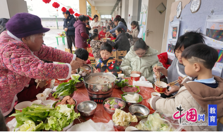 剪纸活动结束后,备受孩子们期待的“亲子火锅宴”温馨开场。火锅作为中国传统的聚餐方式,象征着团圆和幸福。在热气腾腾的火锅前,大家围坐在一起,分享着美食,聊着家常,欢声笑语不断。孩子们在家长的引导下,学会了分享和等待,体验到了集体生活的乐趣。