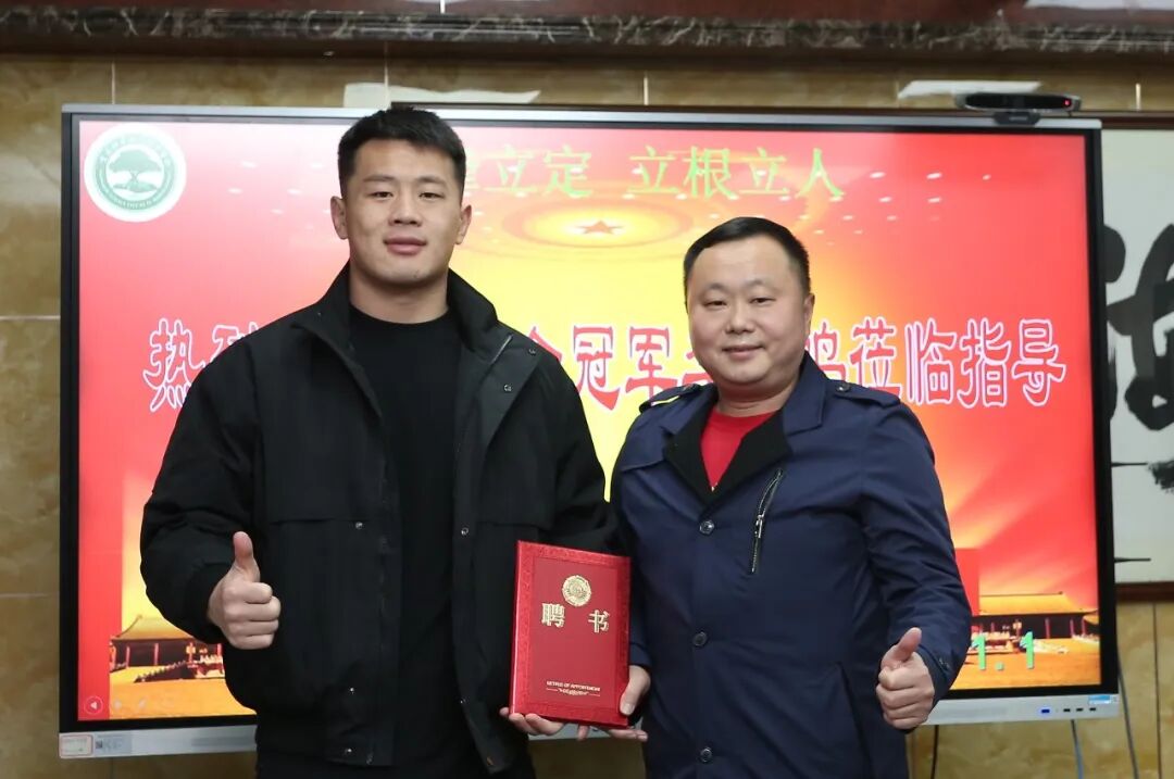随后,大家来到学校会议室,观看学校宣传视频,听取建队经验,并指导加强合力建设,科学持续发展,表态要全力支持学校摔跤训练,认真指导培育孩子们成长,学校书记校长杜朱洪给李一鸣颁发指导聘书。