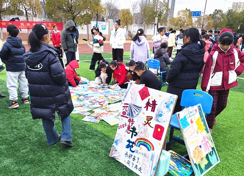 为庆祝2026年元旦佳节,丰富校园文化生活,培养学生的阅读兴趣与节约意识,合肥市五一小学以“欢歌笑语迎新年 遨游书海乐淘淘”为主题,精心策划了元旦迎新会与书籍跳蚤市场系列活动。全校师生欢聚一堂,在欢声笑语中辞别旧岁,在书香氤氲里喜迎新年。