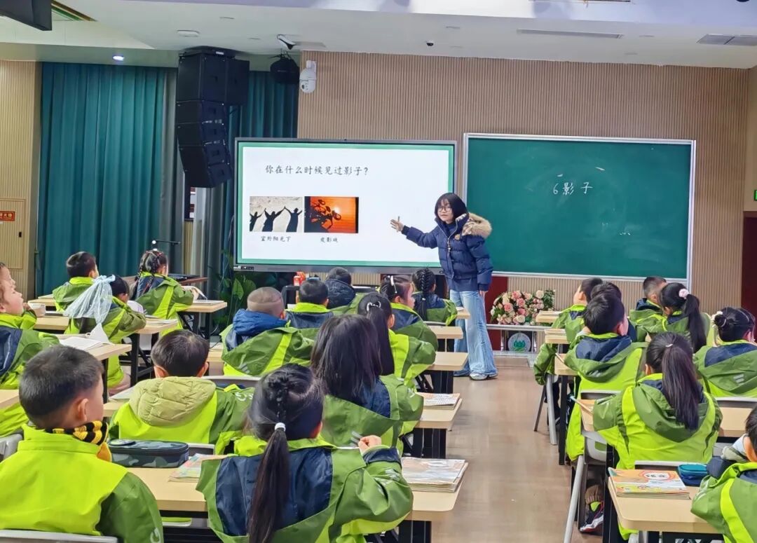 王语涵老师以趣味谜语导入《影子》一课,引导学生联系生活学习“影”字。课中,通过做动作、字源探秘与偏旁归类,引导学生用多元的方法识字。同时,聚焦方位词,进行语言实践。
