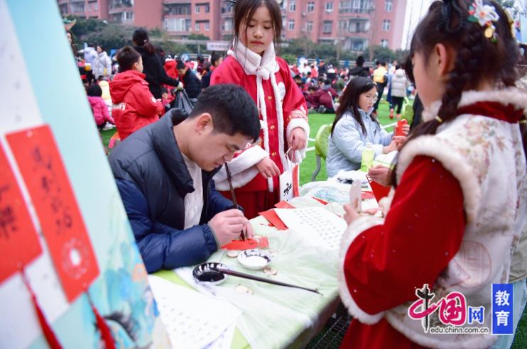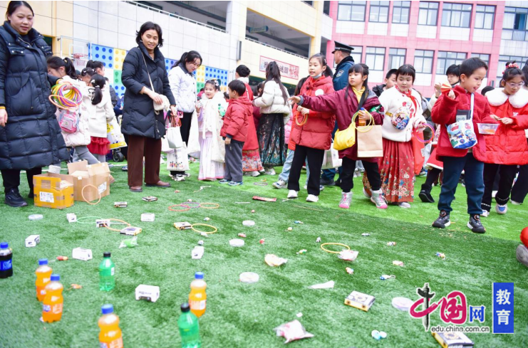 六大区域各具特色、精彩纷呈,尽是老师们、同学们和家长们合作协力的展现舞台。跳蚤集市里,学生以旧物与自然材料创作黏土玩偶、毛线编织、装饰画等手工艺品,并设专区交换或售卖闲置书籍,让书香流动、创意再生。特色美食街由家长志愿者与学生联手经营,山楂雪球、钵仔糕、烤红薯、钵钵鸡、雪梨银耳汤等美味飘香,引得大家流连品味。传统游戏场复刻投壶、射箭、丢沙包、滚铁环等经典项目,欢笑声中重温童年乐趣。巧匠工作坊里,师生共制冰箱贴、福字拓印、国画纸袋、剪纸油纸伞、写春联、水拓漆扇,指尖翻飞间感悟匠心与民俗之美。雅趣猜谜园张灯结彩,新年灯谜引人驻足竞猜;星点小舞台上,萨克斯旋律悠扬,舞姿轻盈翩跹;变魔术的灵巧翻飞,跳街舞的热烈奔放,凡是愿意登台的孩子都轮番亮相。他们将羞涩化作自信,把紧张转为欢畅,用最本真的状态绽放风采。