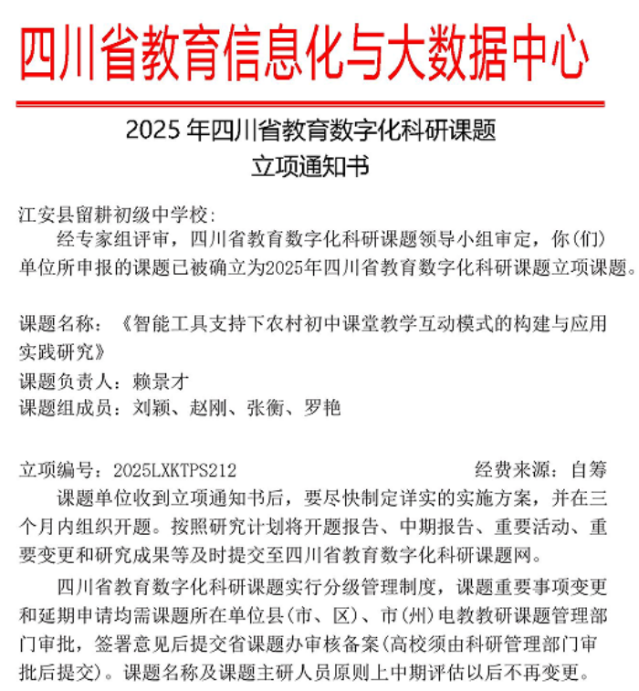 2025年12月底,宜宾市江安县留耕初级中学校由赖景才负责的《智能工具支持下的农村初中课堂教学互动模式的构建与应用实践研究》成功立项为2025年四川省教育数字化科研课题。该课题是留耕中学首次立项成功的省级课题,同时也是教师们深耕教学一线、积极探索创新的集中体现,彰显了学校浓厚的教研氛围与扎实的教研功底。