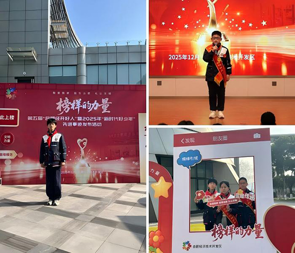 冬日的阳光温暖而明亮,映照出少年们昂扬向上的身影。在第五届合肥经开好人暨2025年合肥经开区“新时代好少年”先进事迹发布活动现场,喜讯传来——合肥一六八玫瑰园学校卜骏毅、周语桐、刘夏弘毅、张若言四位同学凭借优异表现,成功获评区级“新时代好少年”荣誉称号,用实际行动诠释了新时代少年的责任与担当,为学校再添光彩。